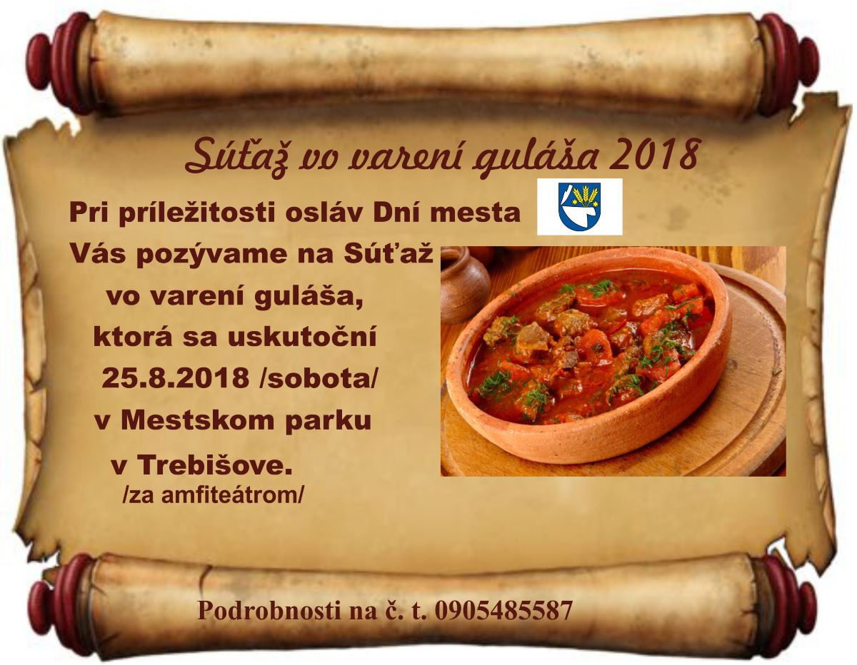 Mesto Trebišov organizuje súťaž vo varení guláša - Memoriál Ľubomíra Koscelníka. Súťaž bude prebiehať počas Dní mesta Trebišov, sobotu 25.8.2018 pri amfiteátri v Mestskom parku v Trebišove.