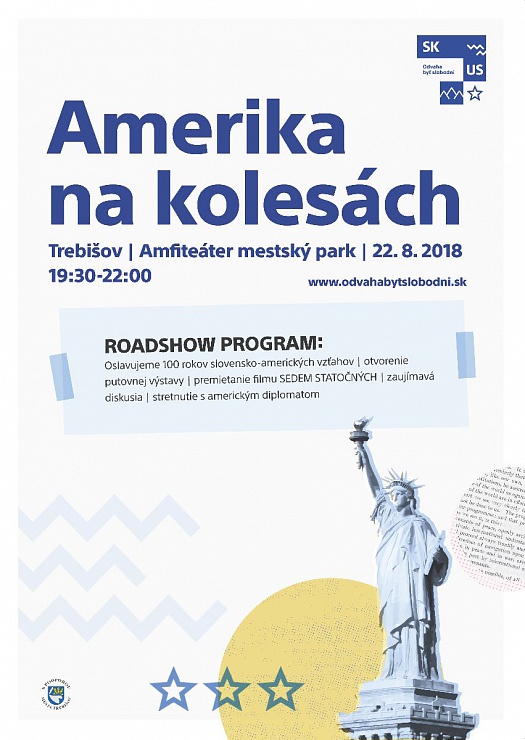 Pri príležitosti osláv 100 rokov slovensko-amerických vzťahov pripravilo americké veľvyslanectvo v spolupráci s mestom Trebišov podujatie „Amerika na kolesách“. V rámci neho bude sprístupnená putovná výstava, preveríte si vedomosti v superkvíze, v ktorom môžete získať vecné ceny. Organizátori poradia ako sa dostať do Ameriky, či už za prácou, alebo za štúdiom. Večer si účastníci podujatia vychutnajú premietanie amerického filmu Sedem statočných a bude možnosť zapojiť sa do diskusie s lokálnymi /regionálnymi/ hrdinami, ktorým cesta do USA zmenila život, či stretnúť sa s americkým diplomatom.