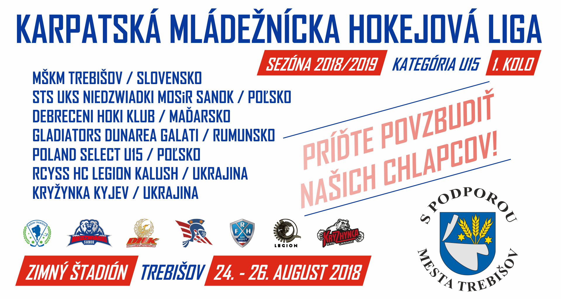 Súčasťou sprievodných podujatí Dní mesta Trebišov 2018 bude aj Karpatská mládežnícka hokejová liga 2018 v dňoch 24. - 26. augusta 2018 na zimnom štadióne v Trebišove.