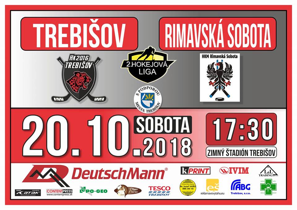Sobotu 20. októbra 2018 o 17.30 h sa uskutoční zápas 2. hokejovej ligy medzi HK 2016 Trebišov a HKM Rimavská Sobota na Zimnom štadióne v Trebišove.