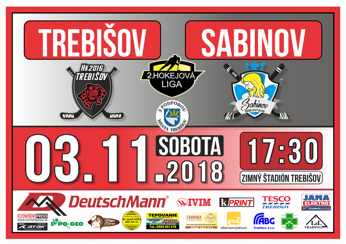 Sobotu 3. novembra 2018 o 17.30 h sa uskutoční zápas 2. hokejovej ligy medzi HK 2016 Trebišov a HK Sabinov na Zimnom štadióne v Trebišove.