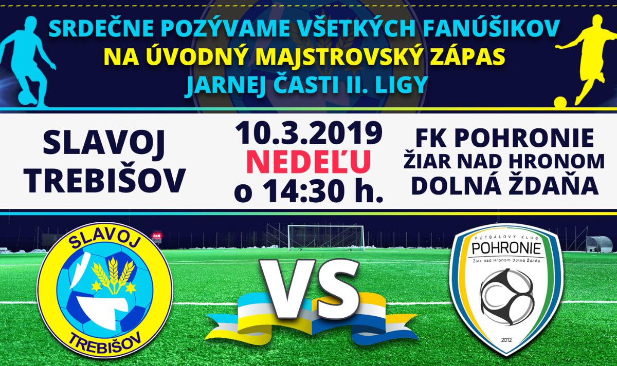 Úvodný majstrovský zápas jarnej časti II. ligy sa uskutoční nedeľu 10. marca 2019 so začiatkom o 14:30 hod. medzi FK Slavoj Trebišov - FK Pohronie Žiar nad Hronom Dolná Ždaňa na domácom ihrisku futbalového štadióna v Trebišove.