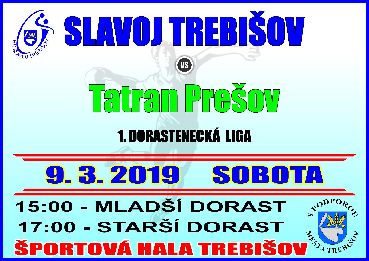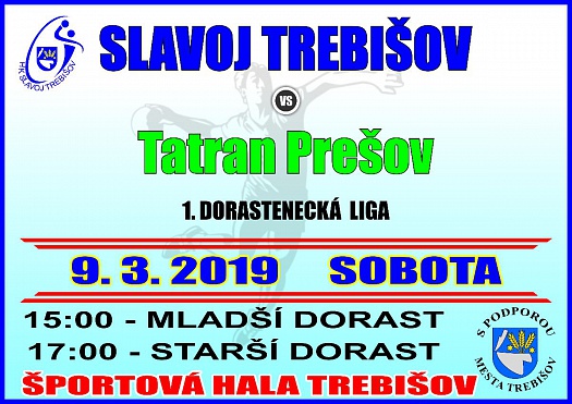 Hádzanársky klub Slavoj Trebišov odohrá domáci zápas 1. dorasteneckej ligy s hráčmi Tatranu Prešov v sobotu 9. marca 2019 v Športovej hale v Trebišove.