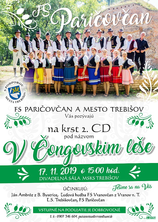 Folklórna skupina PARIČOVČAN pripravuje slávnostný galaprogram, počas ktorého jej členovia uvedú do života svoje druhé CD s názvom V Čongovskim leše.