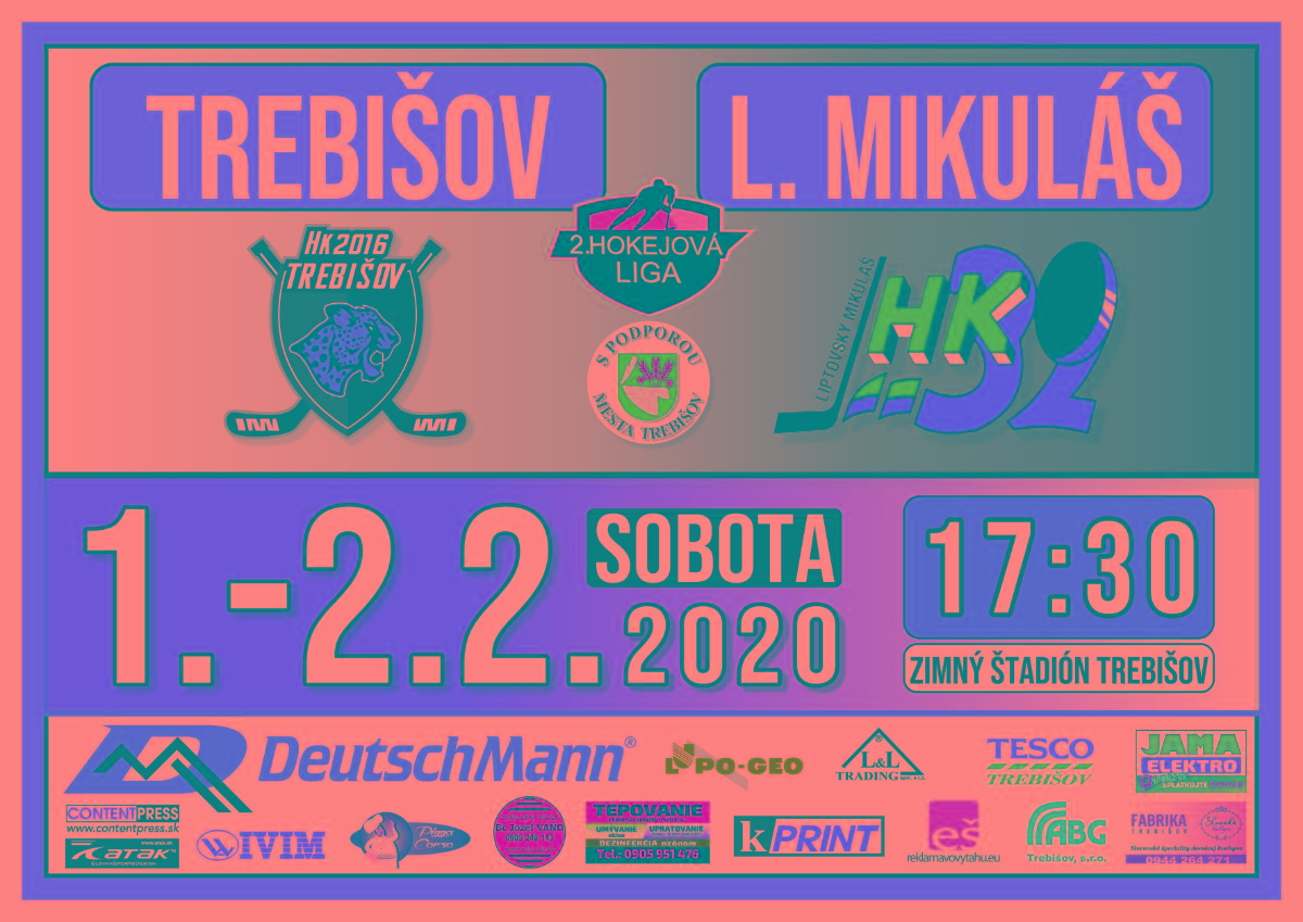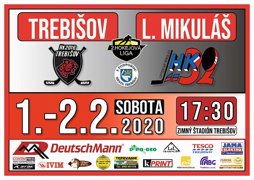 Sobotu 1. 2. 2020 aj nedeľu 2. 2. 2020 so začiatkom o 17.30 h sa uskutoční dvojzápas 2. hokejovej ligy medzi HK 2016 Trebišov a HK L. Mikuláš na ľadovej ploche Zimného štadióna v Trebišove.