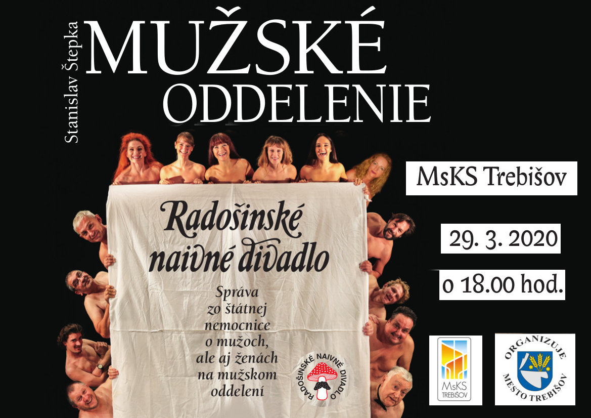 Inscenáciu Mužské oddelenie odohrajú herci RND na divadelných doskách kultúrneho strediska v Trebišove nedeľu 29. marca 2020 o 18.00 hod.