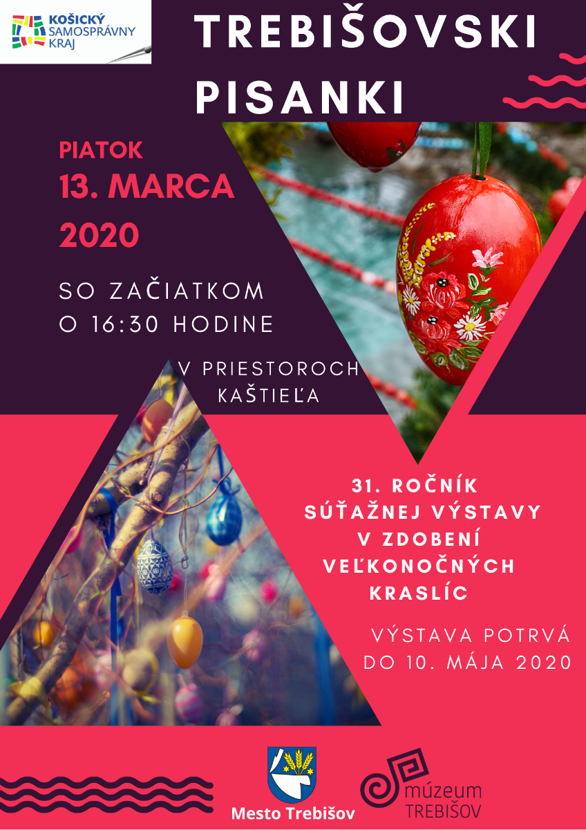 Múzeum a Kultúrne centrum Južného Zemplína v Trebišove, kultúrne zariadenie Košického samosprávneho kraja, usporiada vernisáž výstavy v zdobení veľkonočných kraslíc s názvom TREBIŠOVSKI PISANKI. Slávnostné otvorenie 31. ročníka výstavy sa uskutoční 13. marca 2020 o 16:30 hod. v priestoroch kaštieľa. Výstava potrvá do 10. mája 2020.