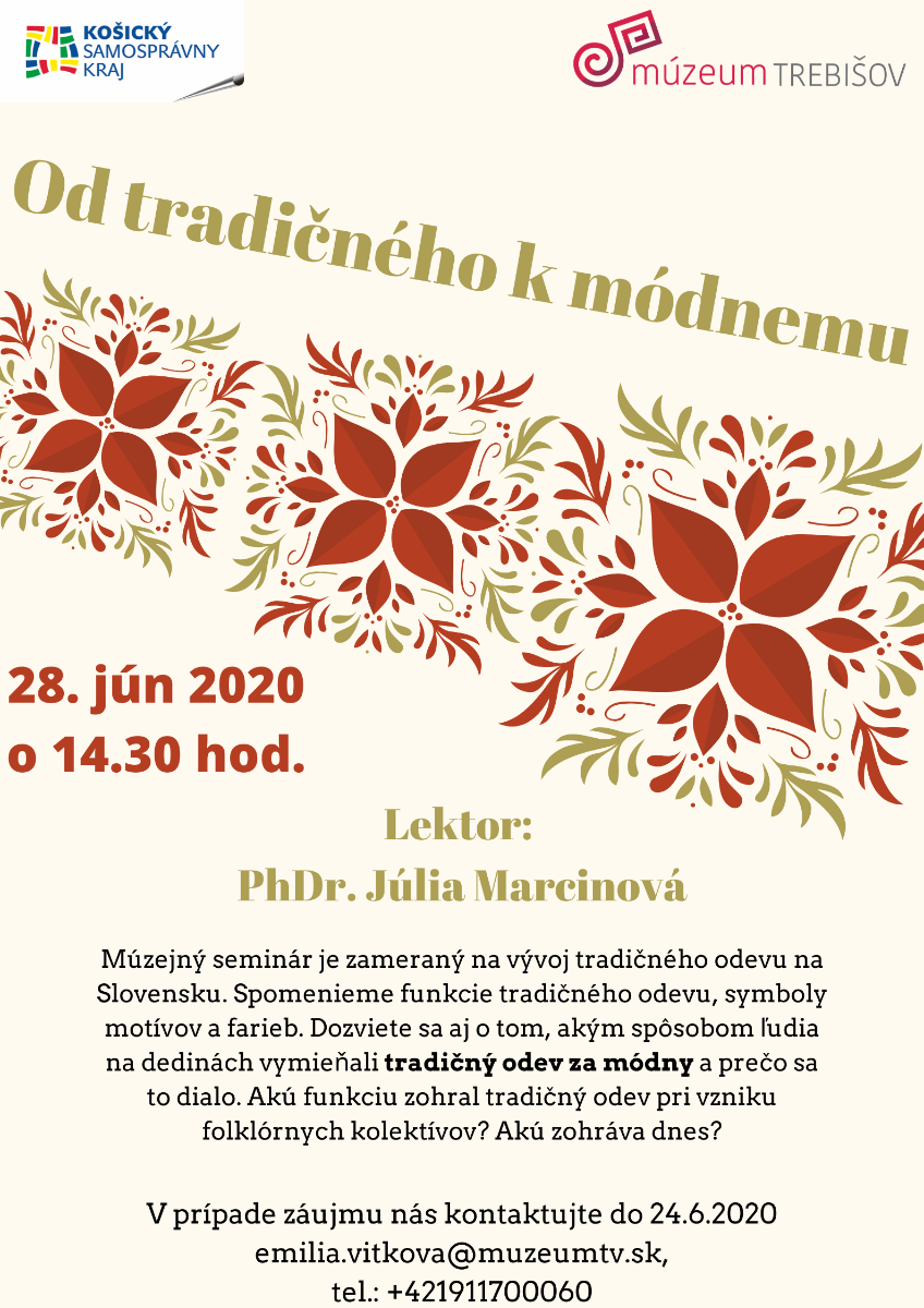 Múzejný seminár povedie PhDr. Júlia Marcinová z Katedry mediamatiky a kultúrneho dedičstva zo Žilinskej univerzity. Seminár je zameraný na vývoj tradičného odevu na Slovensku. Spomínať sa budú funkcie tradičného odevu, symboly motívov a farieb. Návštevníci sa dozvedia aj to, akým spôsobom ľudia na dedinách vymieňali tradičný odev za módny a prečo sa to dialo. Akú funkciu zohral tradičný odev pri vzniku folklórnych kolektívov? Akú zohráva dnes? Priestor bude aj na spoločnú rozpravu a pomenovanie súčasných javov či problémov správnym menom.