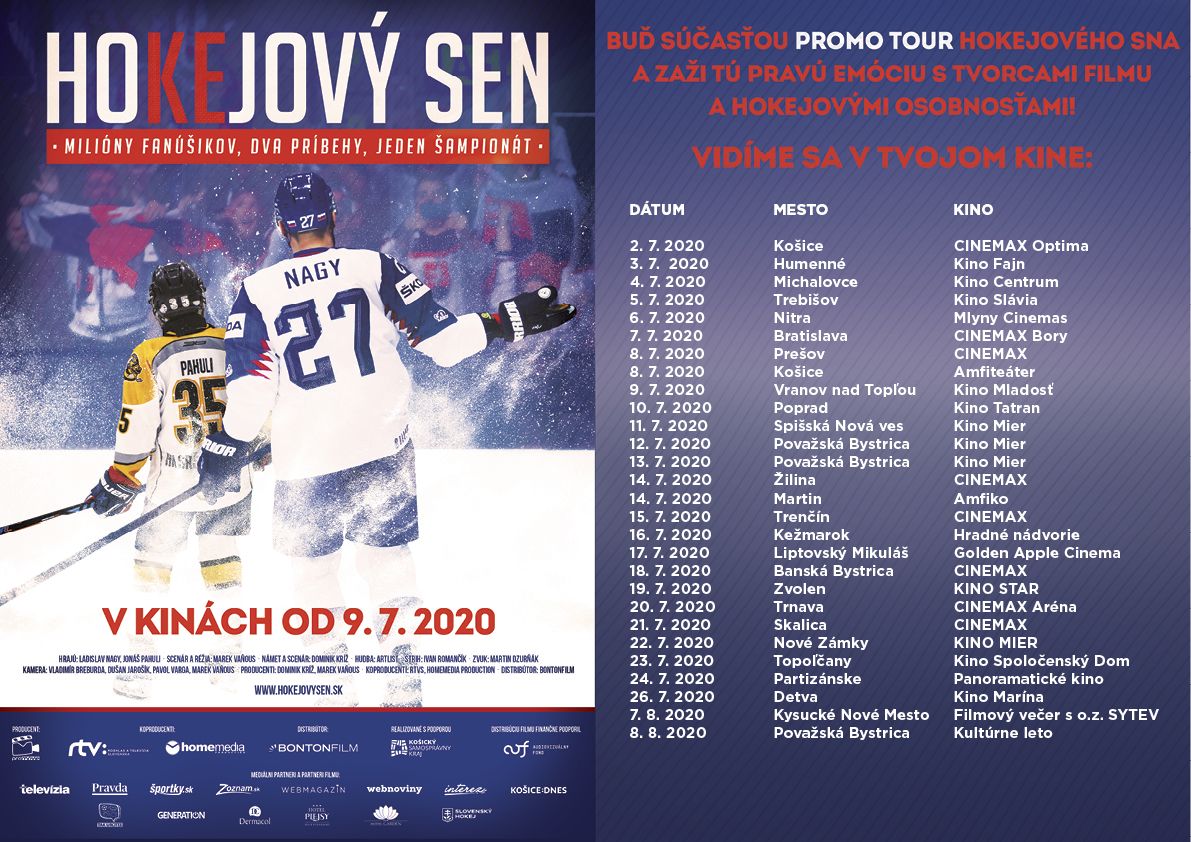 Buď aj TY súčasťou najväčšej kino PROMO TOUR, aká tu kedy bola! Zaži nedeľu 5. júla o 17.00 h v kinosále MsKS Hokejový sen s tvorcami filmu a hokejovými osobnosťami pravú športovú atmosféru a silné emócie!