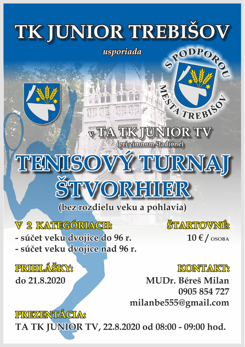 TK Junior Trebišov s podporou mesta Trebišov pripravuje sobotu 22. 8. 2020 Tenisový turnaj štvorhier (bez rozdielu veku a pohlavia). Športové podujatie sa uskutoční v areáli tenisového klubu Junior, pri zimnom štadióne.