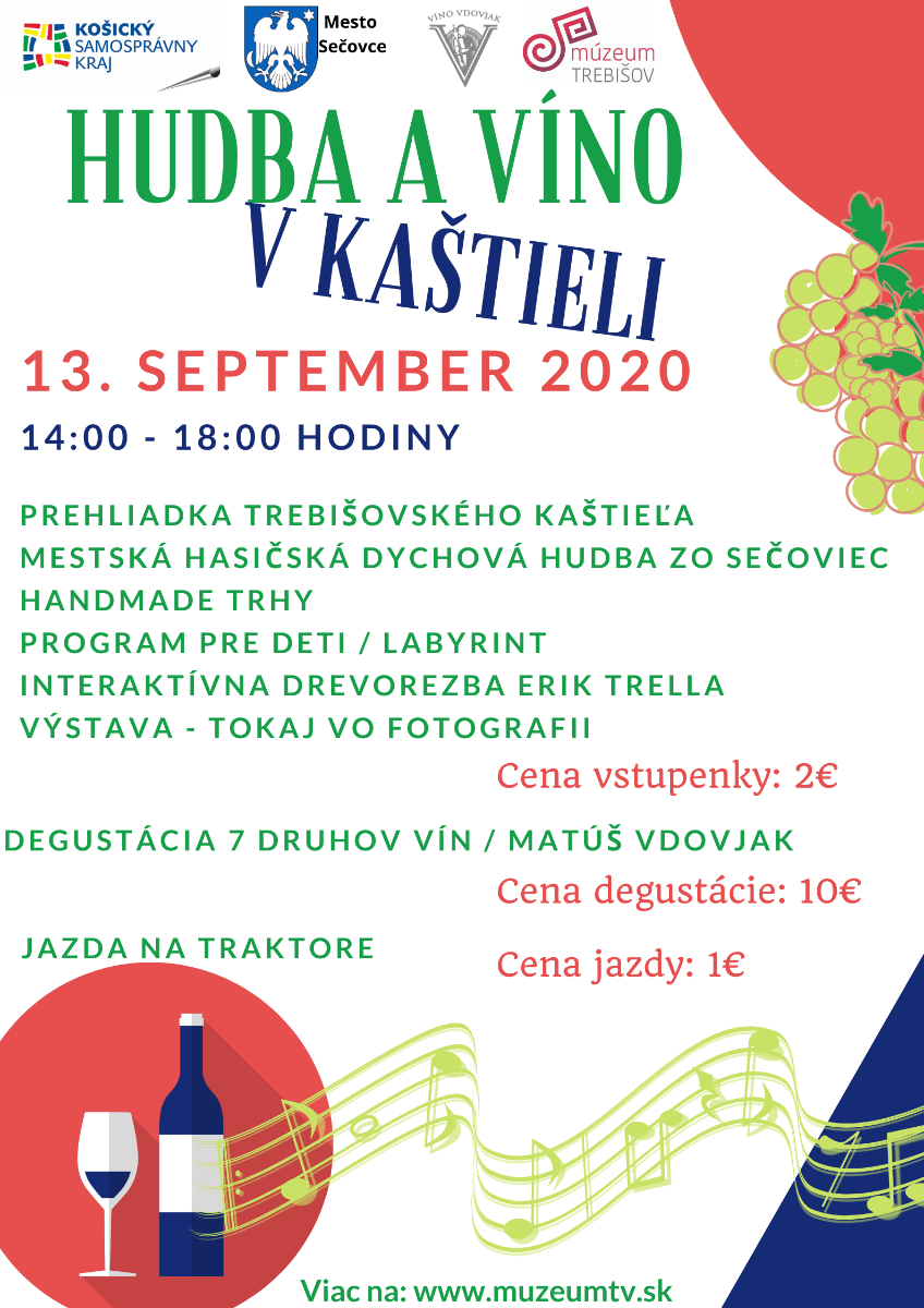 Múzeum a Kultúrne centrum južného Zemplína v Trebišove, kultúrne zariadenie Košického samosprávneho kraja, organizuje podujatie s názvom Hudba a víno v kaštieli 13. septembra 2020 od 14:00 do 18:00 hodiny v areáli kaštieľa.