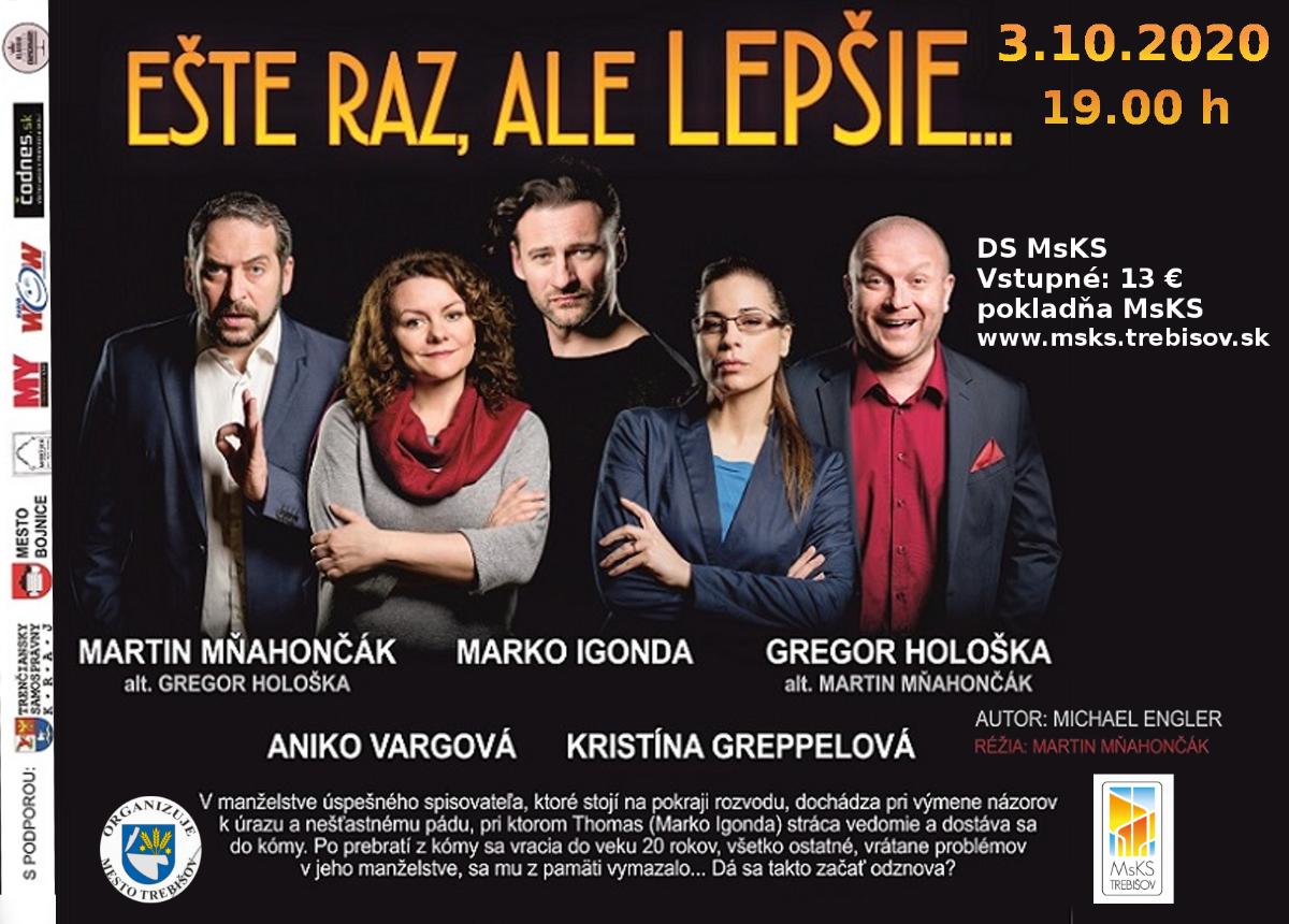 Divadlo KUMŠT TEATRO uvádza romantickú komédiu EŠTE RAZ, ALE LEPŠIE. Na divadelných doskách Mestského kultúrneho strediska v Trebišove si túto hru môžete pozrieť sobotu 3. 10. 2020 o 19.00 h