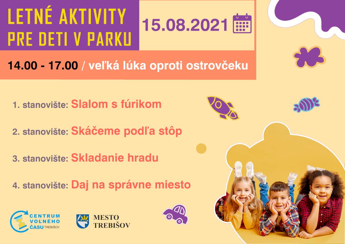 Pozývame najmladšiu generáciu Trebišovčanov stráviť 2 nedeľné popoludnia - 15. augusta a 22. augusta, stále od 14.00 do 17.00 hod. do mestského parku, kde sa môžu zapojiť do rôznych športových aktivít a hier, ktoré pre ne pripravilo Centrum voľného času (CVČ) v spolupráci s Mestom Trebišov.