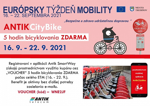 Registrovaní používatelia v aplikácii Antik SmartWay získajú prostredníctvom zadania kódu v časti „VOUCHER“ 5 hodín bicyklovania zdarma každý deň počas trvania kampane ETM, bez potreby vloženia depozitu alebo kreditu.