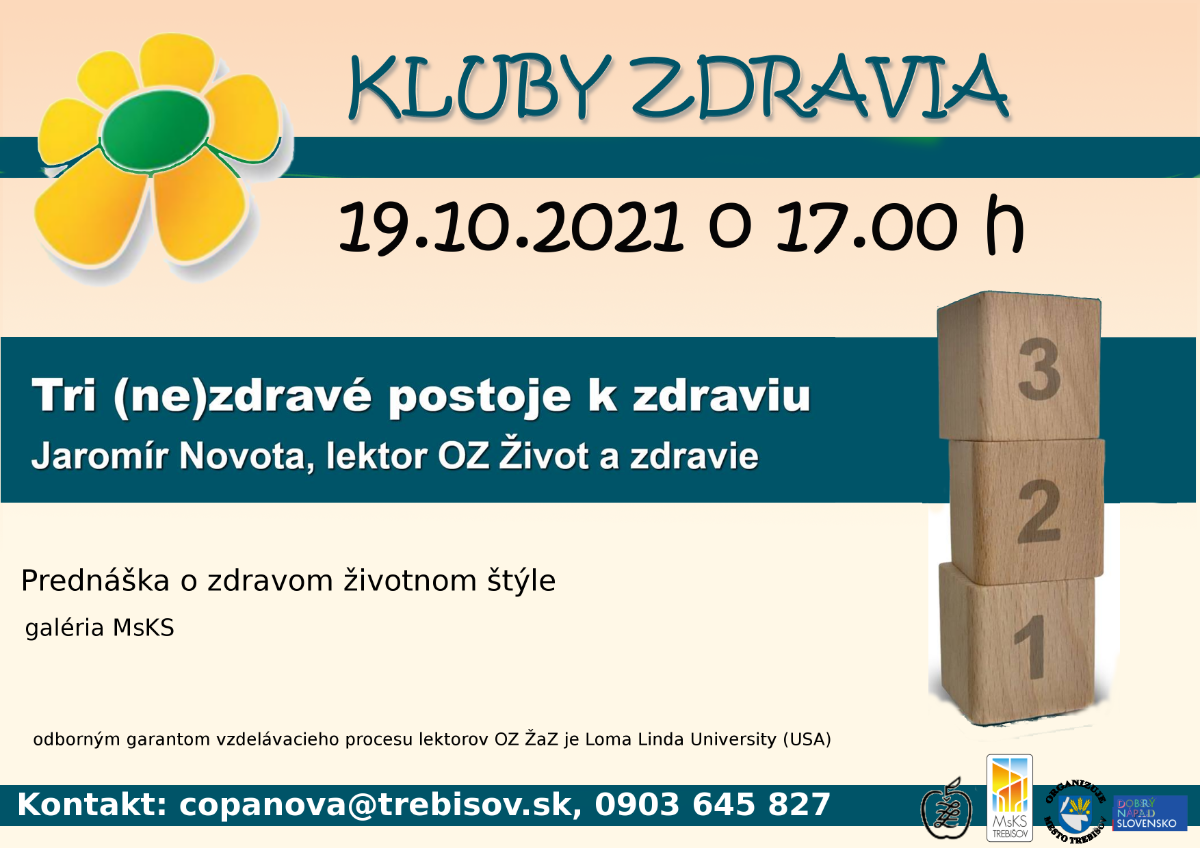 Mesto Trebišov v spolupráci s občianskym združením Život a zdravie začínajú jesenný cyklus prednášok KLUBOV ZDRAVIA. Prvé stretnutie sa uskutoční utorok 19. októbra 2021 o 17.00 h v galérii MsKS na tému: Tri (ne)zdravé postoje k zdraviu