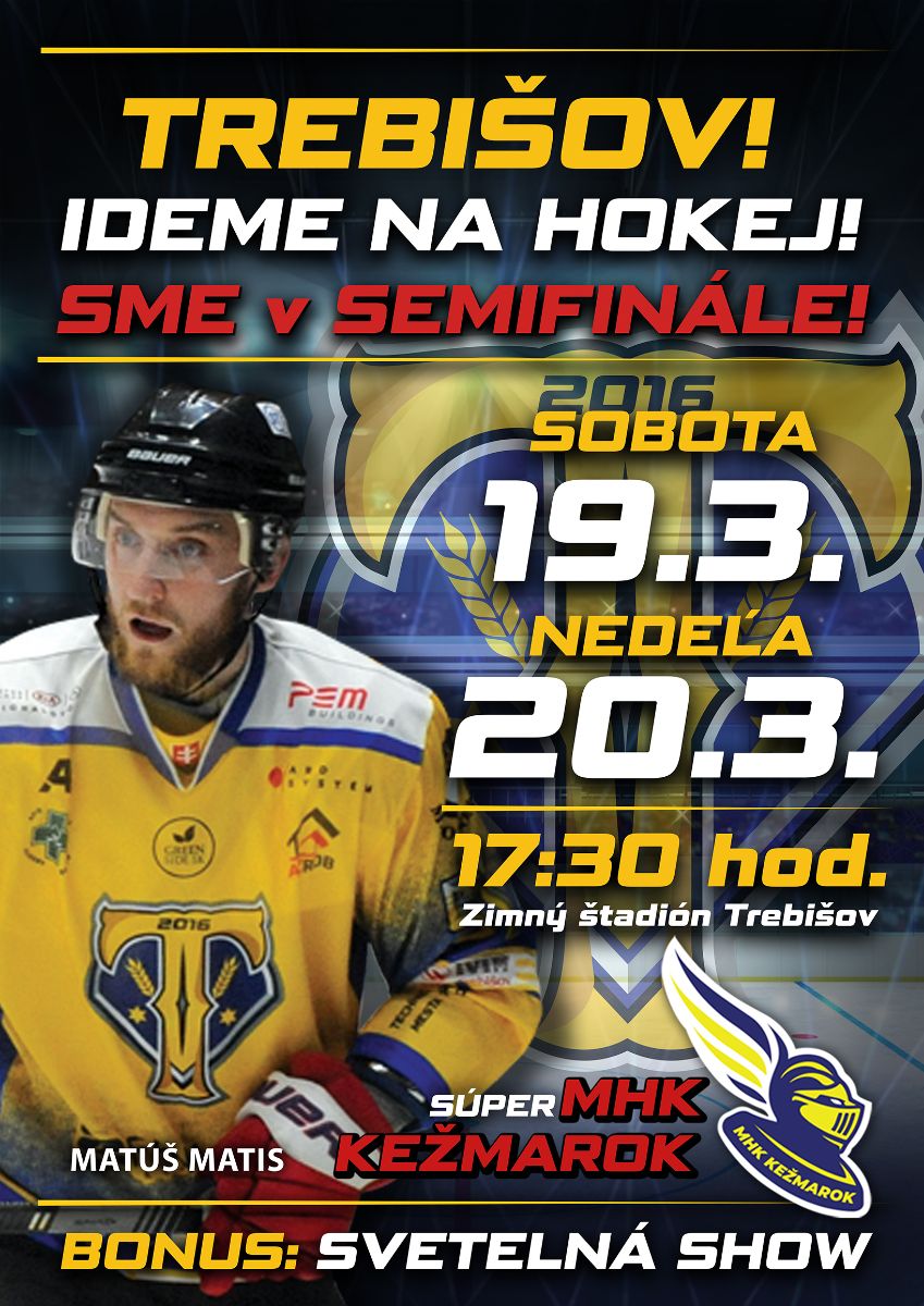 Hokejisti trebišovského klubu HK STEEL Team zabojujú sobotu 19. 3. a nedeľu 20. 3. proti MHK Kežmarok na domácom ľade v semifinále. Obidva víkendové dni začiatok zápasov o 17:30 hod. Diváci sa môžu tešiť okrem svetelnej šou aj na videoprojekciu a mega-tombolu.