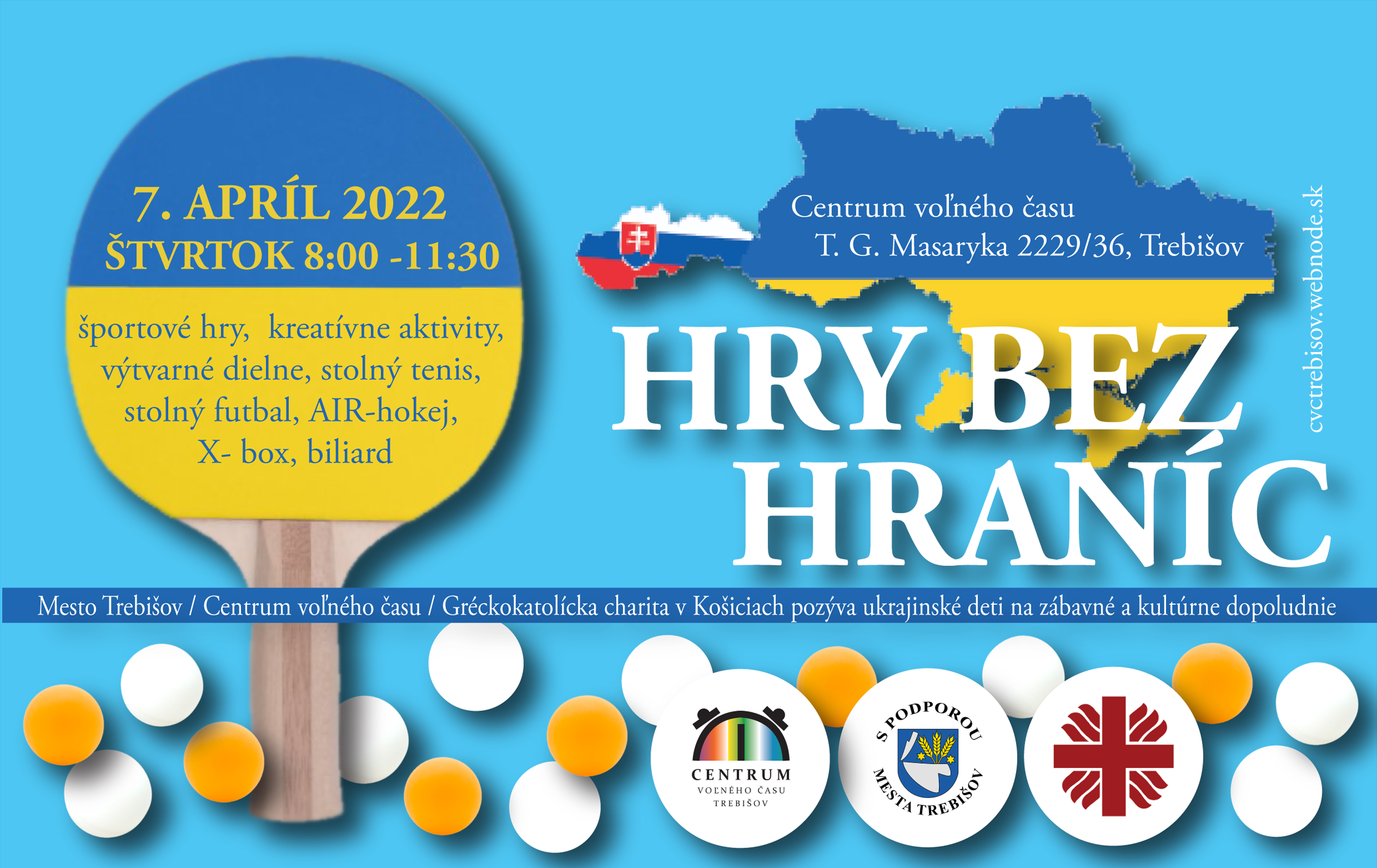 Centrum voľného času v Trebišove v spolupráci s Gréckokatolíckou charitou Košice a podporou mesta Trebišov usporiadajú štvrtok 7. apríla 2022 kultúrne a zábavné podujatie s názvom HRY BEZ HRANÍC.