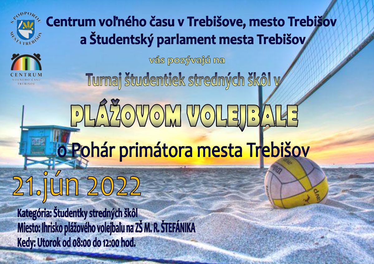 Centrum voľného času v Trebišove, mesto Trebišov a Študentský parlament mesta Trebišov usporiadajú Turnaj študentiek stredných škôl v plážovom volejbale o Pohár primátora mesta Trebišov