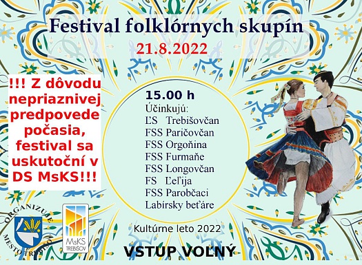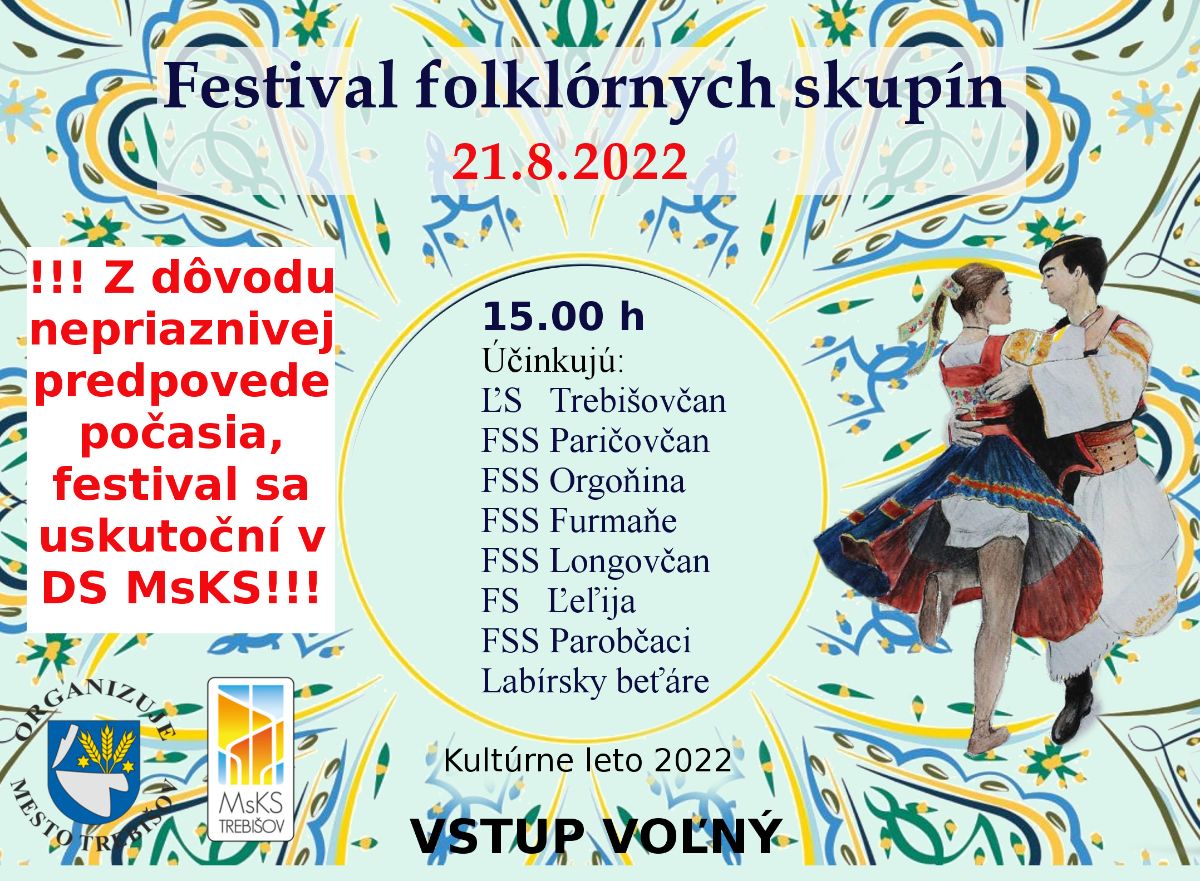 Program kultúrneho leta - FESTIVAL FOLKLÓRNYCH SKUPÍN - nedeľu 21. 8. so začiatkom o 15.00 h sa presúva z amfiteátra do divadelnej sály MsKS, z dôvodu avizovaného nepriaznivého počasia a očakávaného výskytu búrok.