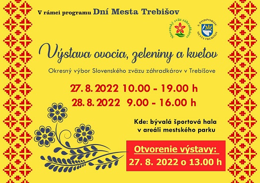 Ďalším sprievodným podujatím Dní mesta Trebišov bude víkendová Výstava ovocia, zeleniny a kvetov, ktorú môžu záujemcovia obdivovať sobotu 27. 8. aj nedeľu 28. 8. v budove Správy parku (bývalá športová hala).