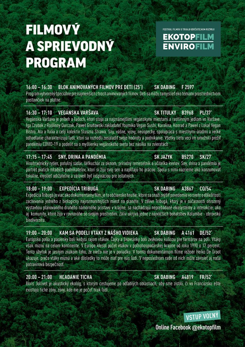 Filmový festival Ekotopfilm - Envirofilm prichádza po dvoch rokoch pandemických obmedzení opäť do Trebišova. Stredu 19. októbra 2022 prinesie do Mestského kina Slávia víťazné dokumentárne filmy festivalu počas svojej TOUR 2022.