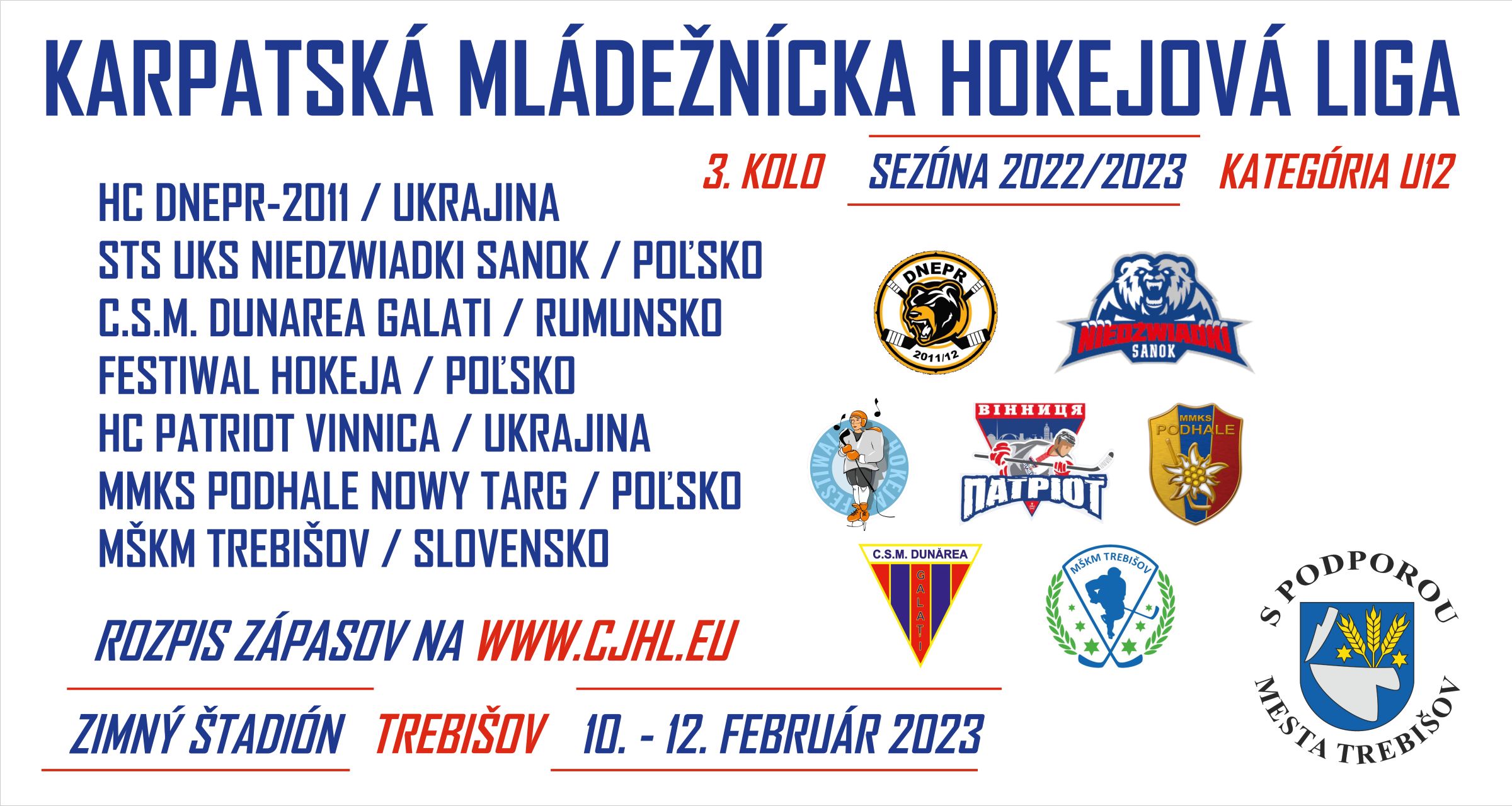 Mestský športový klub mládeže Trebišov organizuje na Zimnom štadióne v Trebišove 3. kolo Karpatskej mládežníckej hokejovej ligy v kategórii U12.