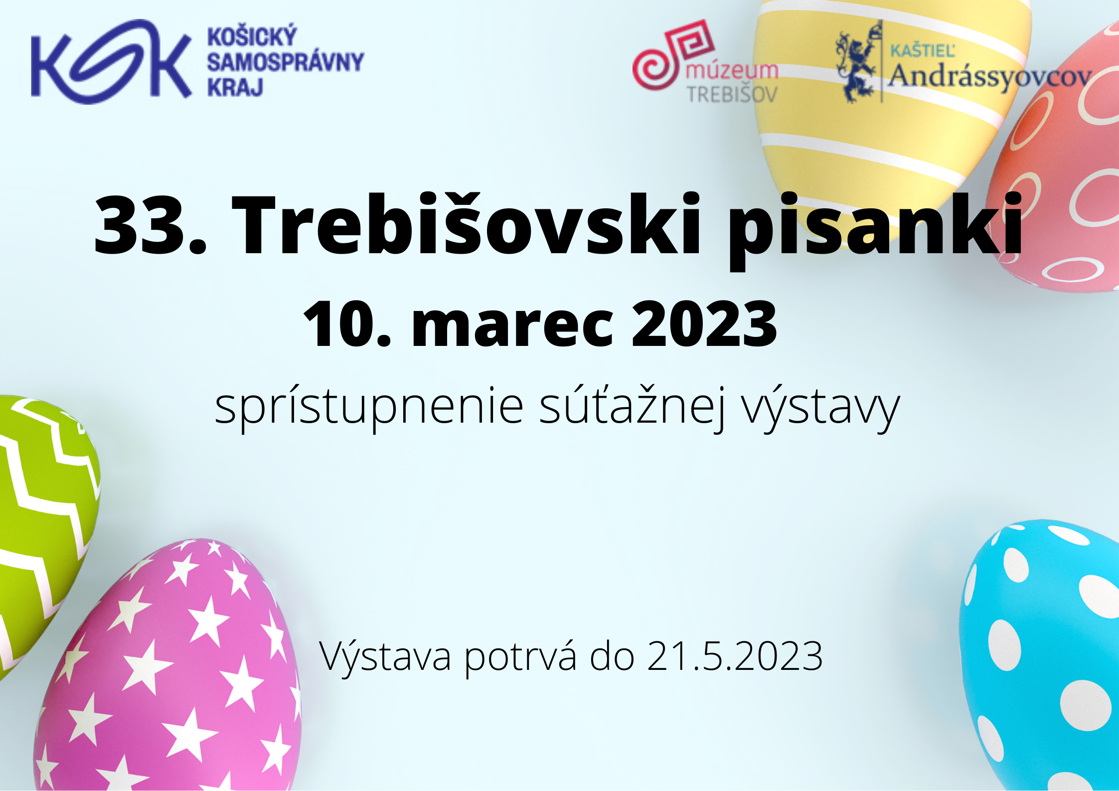 Múzeum a Kultúrne centrum južného Zemplína v Trebišove, kultúrne zariadenie Košického samosprávneho kraja, organizuje už 33. ročník súťažnej výstavy v zdobení veľkonočných kraslíc Trebišovski pisanki. Výstava bude verejnosti sprístupnená 10. marca 2023 v priestoroch dvorany trebišovského kaštieľa.