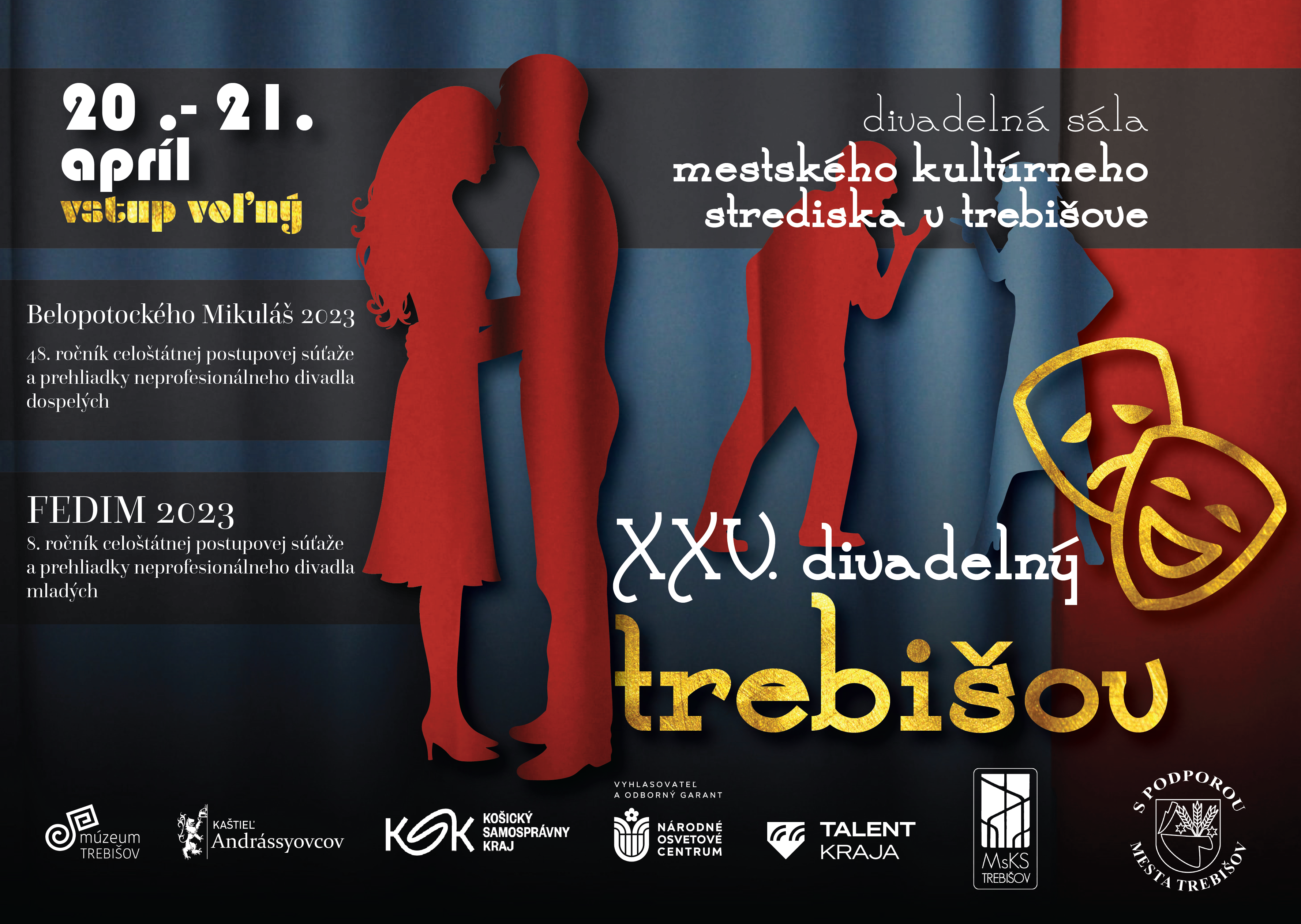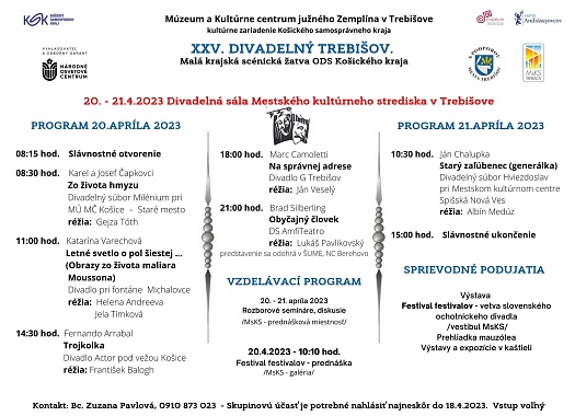 Múzeum a kultúrne centrum južného Zemplína v Trebišove,kultúrne zariadenie Košického samosprávneho kraja, organizuje v dňoch 20.4.2023 a 21.4.2023 v poradí už 25. ročník krajskej súťažnej prehliadky amatérskeho divadla mladých a amatérskeho divadla dospelých s názvom XXV. Divadelný Trebišov. Malá krajská scénická žatva ochotníckych divadelných súborov Košického kraja, ktorá prebehne v priestoroch divadelnej sály Mestského kultúrneho strediska v Trebišove.