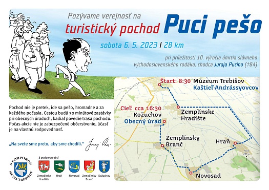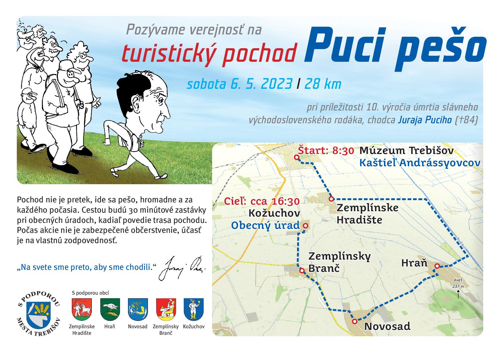 V sobotu 6. mája 2023 sa uskutoční pochod pre verejnosť s názvom „Puci pešo“. Trasa meria 28 kilometrov a vedie z Trebišova do Kožuchova - rodnej obce Juraja Puciho. Od smrti tohto slávneho diaľkového chodca tento rok uplynie 10 rokov. Podujatie prebehne za účasti Puciho vnučiek a synov, ktorí pochod organizujú. Pozvaná je široká verejnosť, na pochod sa netreba vopred registrovať.