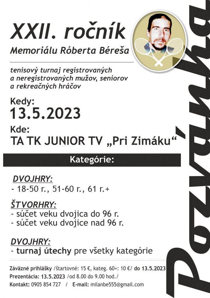 Tenisový klub Junior Trebišov organizuje sobotu 13. mája 2023 XXII. ročník Memoriálu Róberta Béreša v športovom areáli TA TK Junior Trebišov (pri zimnom štadióne).