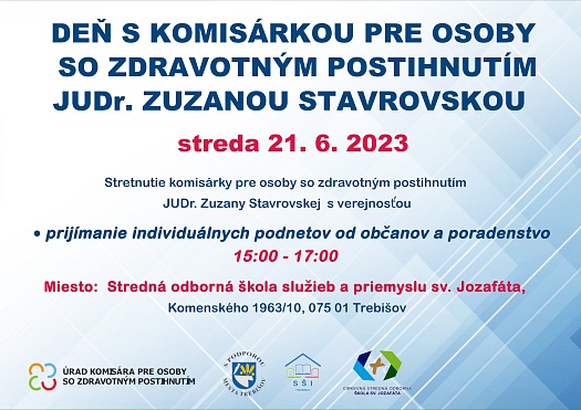 Stredu 21. júna sa budú môcť Trebišovčania stretnúť s komisárkou pre osoby so zdravotným znevýhodnením JUDr. Zuzanou Stavrovskou.