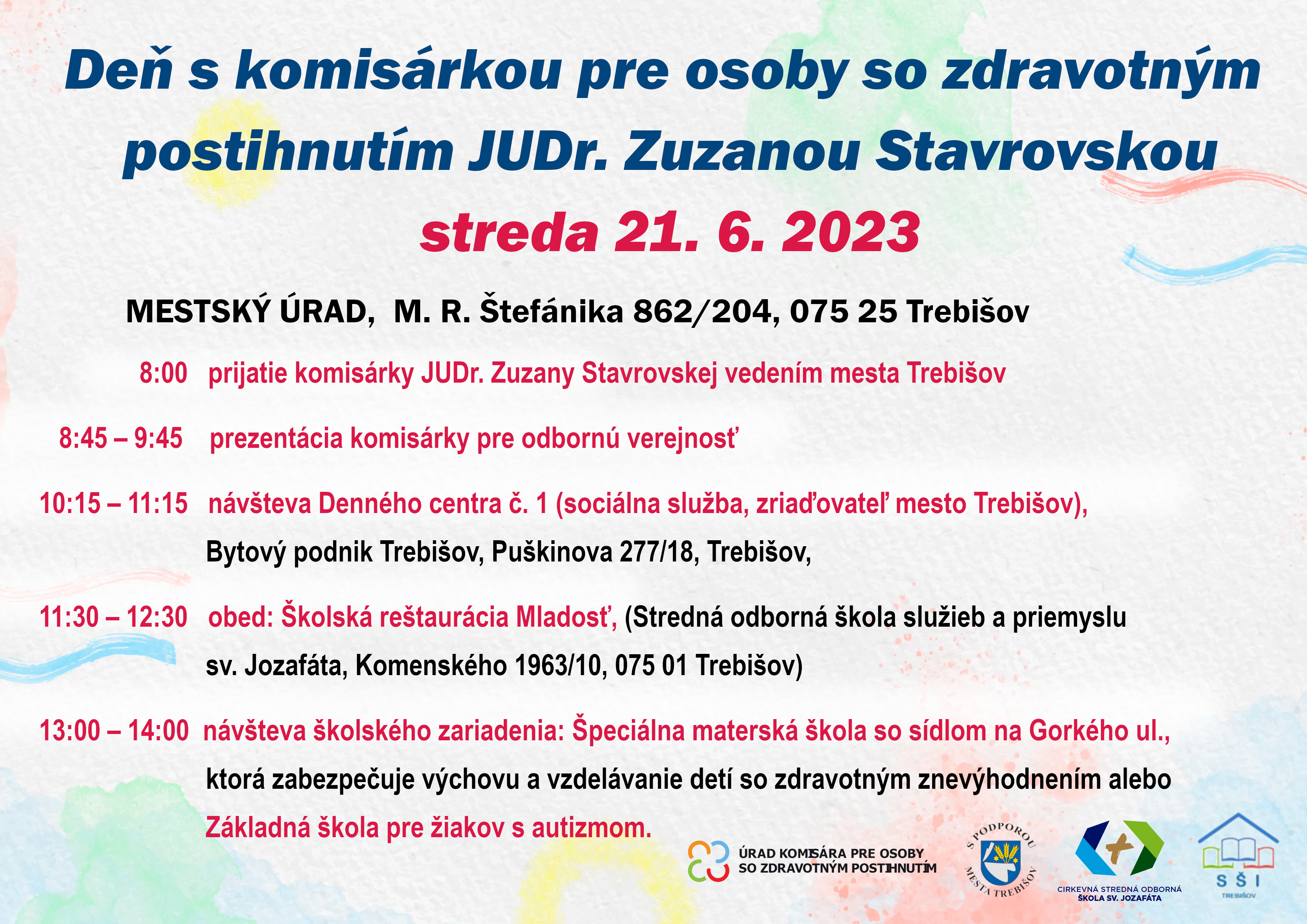 Predpoludním sa komisárka spolu so svojím tímom stretne s predstaviteľmi a zástupcami mesta, zamestnancami štátnych, verejných aj mimovládnych organizácií pôsobiacich v oblasti pomoci ľuďom so zdravotným postihnutím.