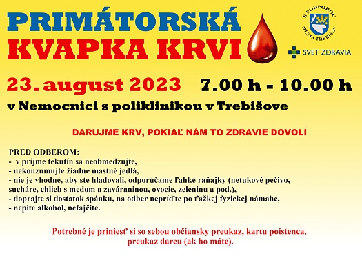 Milí Trebišovčania, nezabudnite, že Dňami mesta Trebišov aj pomáhame tým, ktorí to skutočne potrebujú. Vyčleňte si stredu 23. augusta 2023 na darovanie životne dôležitej tekutiny.
