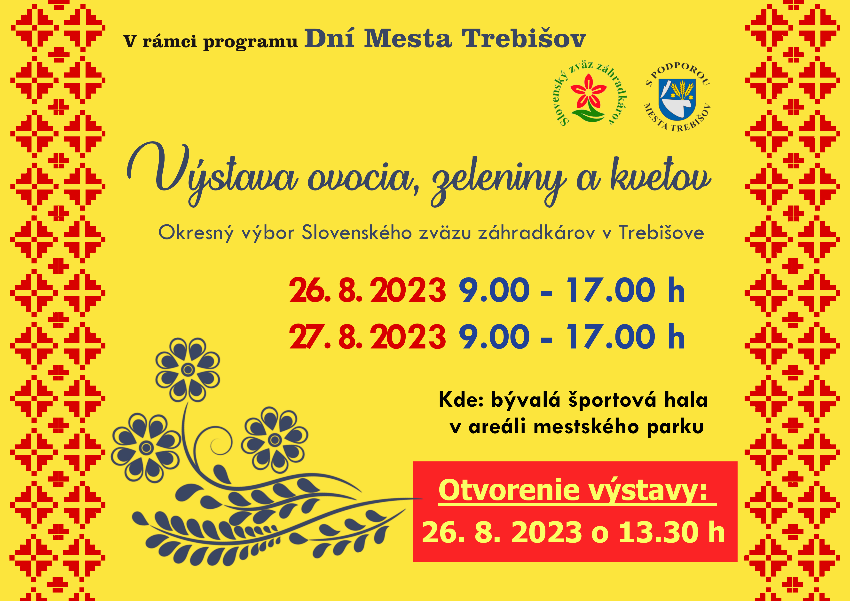 Výstavu ovocia, zeleniny a kvetov si návštevníci DNÍ MESTA TREBIŠOV môžu prísť pozrieť do budovy Správy parku počas víkendu 26. - 27.8. v čase od 9.00 do 17.00. Obdivujte s nami krásne a chutné plody našich záhradkárov.