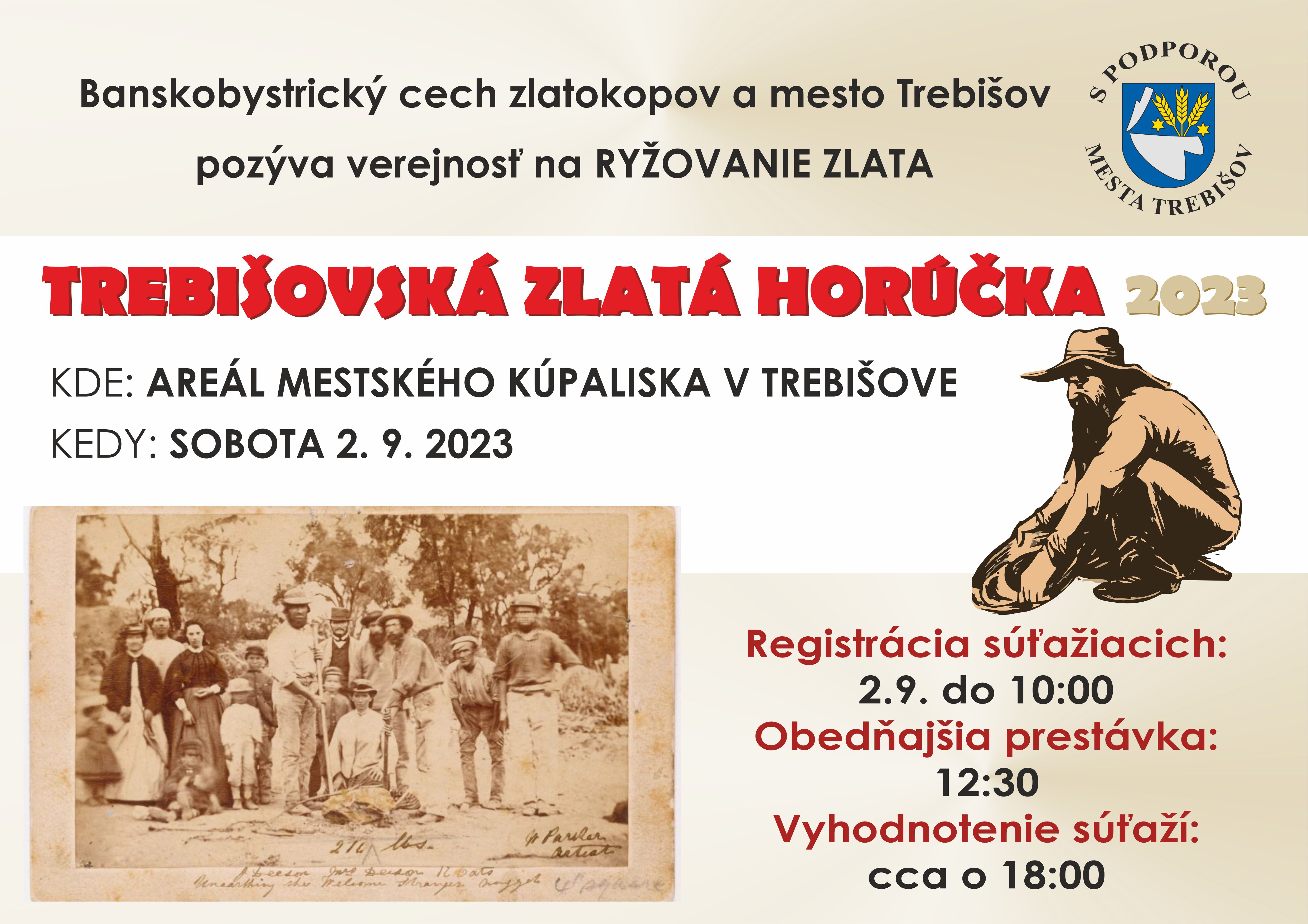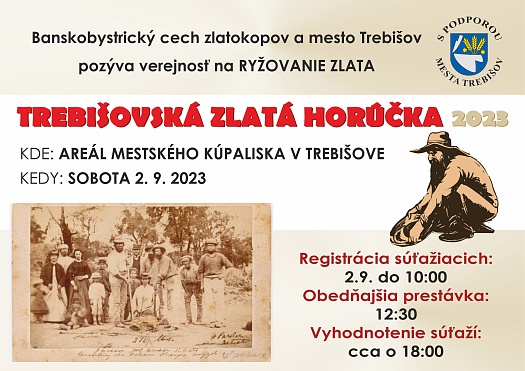 Členovia Banskobystrického cechu zlatokopov spolu s mestom Trebišov pripravili na sobotu 2. 9. 2023 športovo-rekreačno-súťažné podujatie TREBIŠOVSKÁ ZLATÁ HORÚČKA 2022, počas ktorého sa budú súťažiaci snažiť vyryžovať čo najviac zlatiniek.
