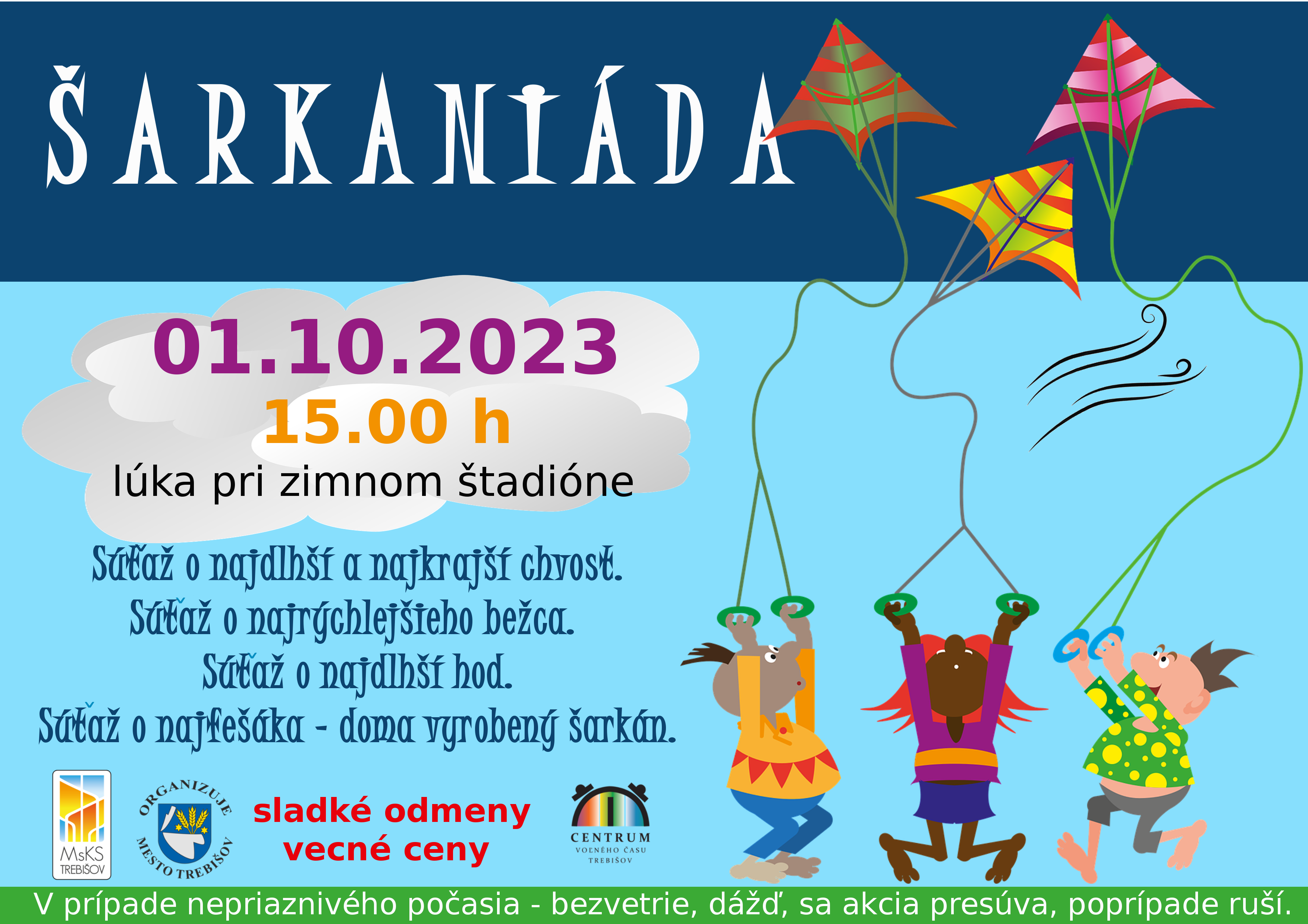 Tešíme sa na vašich farebných šarkanov, ktoré sú priamou vstupenkou do pripravených súťaží. Peknými cenami odmeníme: „najrýchlejšieho bežca“,„najdlhší chvost“ šarkana, „najdlhší hod“,„najfešáka - doma vyrobeného šarkana“.