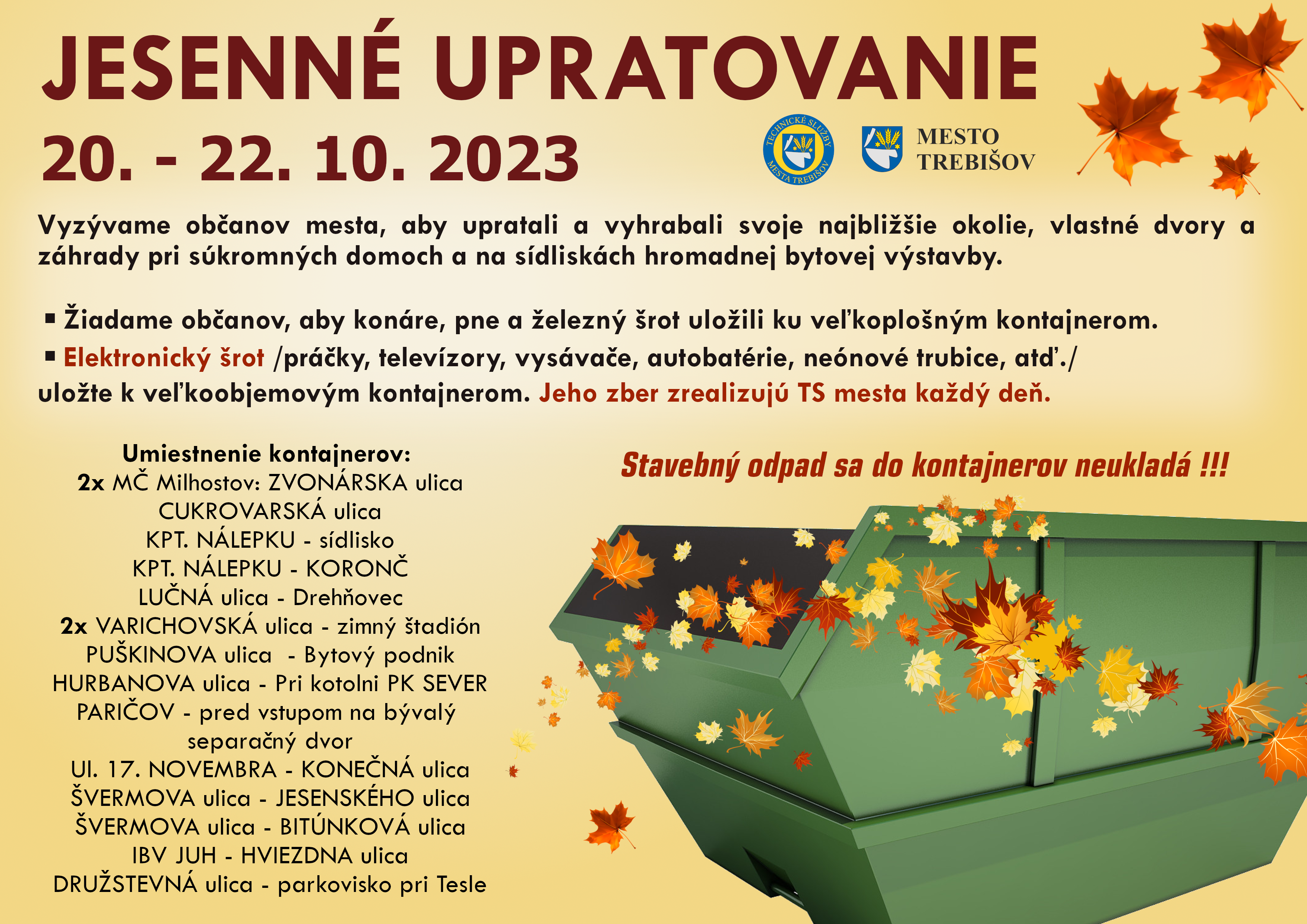 Technické služby mesta Trebišov opäť po lete rozmiestnia veľkoobjemové kontajnery v intraviláne mesta, tie poslúžia obyvateľom na uloženie odpadu, ktorý vypratajú zo svojho okolia, dvorov a záhrad, či zo sídlisk hromadnej bytovej výstavby.