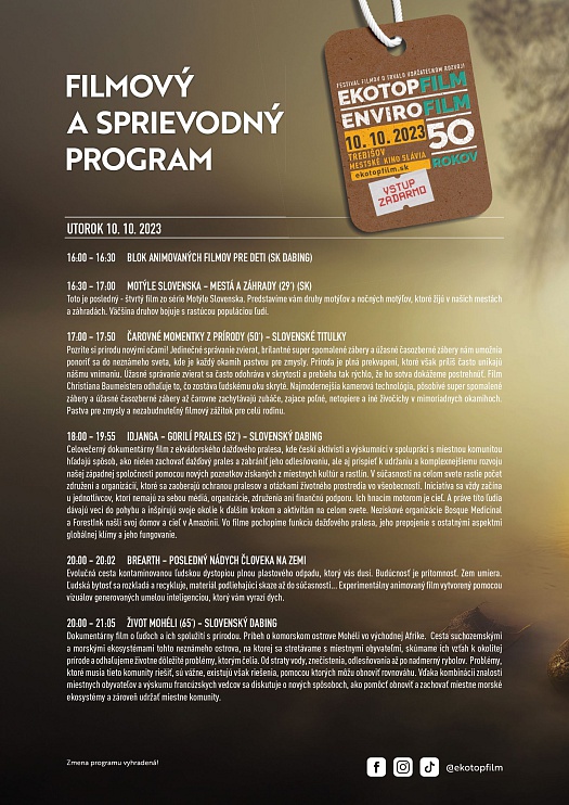 Najstarší filmový festival Ekotopfilm - Envirofilm oslavuje 50 rokov a prináša už 10.10.2023 do Trebišova do Mestského kina Slávia víťazné dokumentárne filmy festivalu počas svojej TOUR 2023.