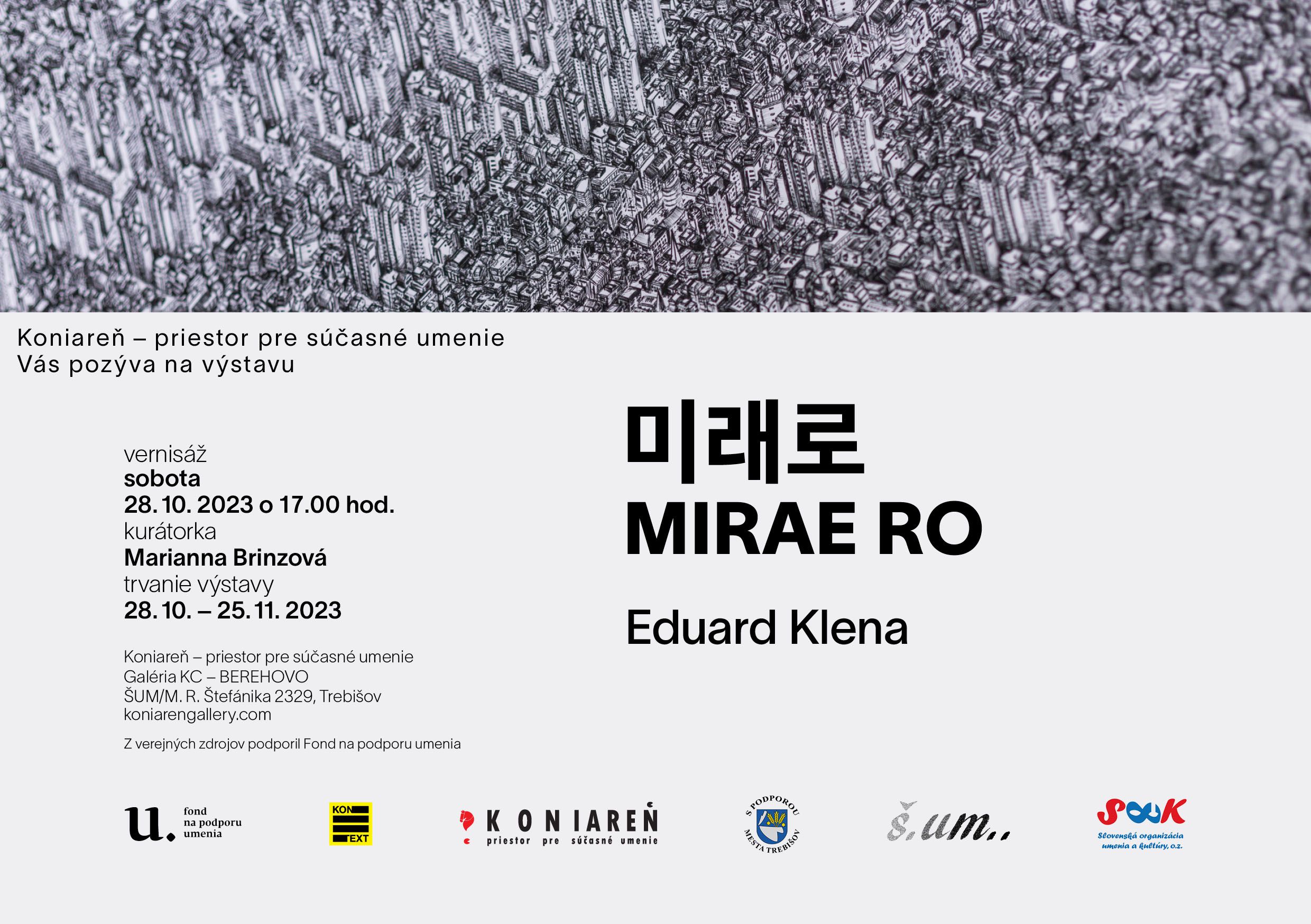 Eduard Klena prostredníctvom výstavy 미래로/MIRAE RO/Do budúcnosti skúma problematiku bujnejúcej aglomerácie kozmopolitných kórejských miest, ktoré dáva do súvislosti s tými našimi, lokálnymi. Snaží sa demonštrovať, že to, čo sa deje v globále, môže podobne fungovať i na menšom území. Problematiku ázijských miest skúma už pár rokov, zo vzdialenosti, ale i z blízka, kedy počas vysokoškolského štúdia absolvoval niekoľko pobytov v kórejskom meste Soul. Leitmotívom výstavy je nesúlad medzi potrebami a nastaveniami jednotlivca/jednotlivkyne, a tým čo sa pokladá za takzvaný všeobecný úzus, stereotyp či akúsi vyššiu prioritu z pohľadu národu, štátu, vládneho alebo politického záujmu.