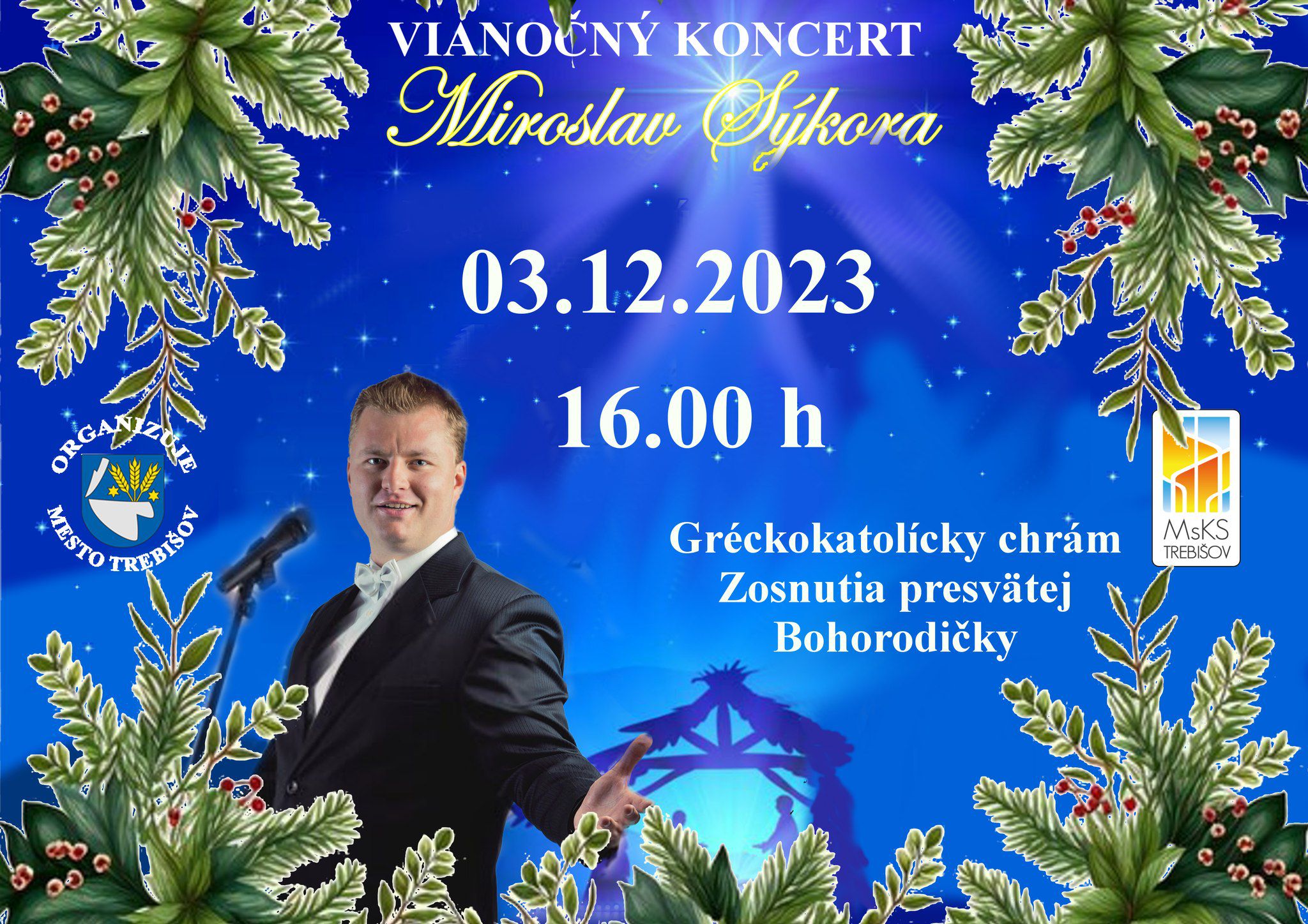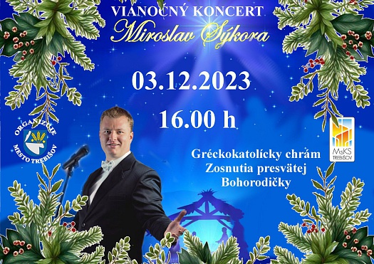 Pozývame Vás na Vianočný koncert Miroslava Sýkoru, ktorý sa uskutoční 3. 12. 2023 o 16:00 hod. v Gréckokatolíckom chráme Zosnutia presvätej Bohorodičky v Trebišove. Príďte si vychutnať tóny opernej hudby, v podaní talentovaného umelca.