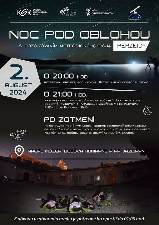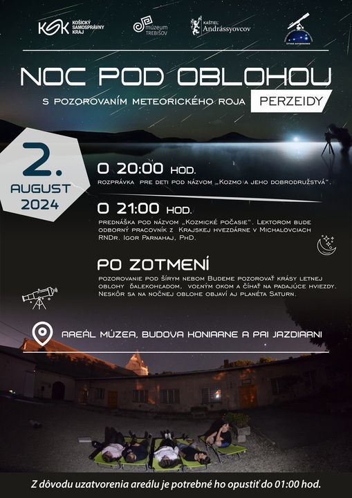 Pozývame Vás na tradičné podujatie Noc pod oblohou spojené s pozorovaním meteorického roja Perzeidy. Uskutoční sa v piatok 2.8.2024. Perzeidy patria ku každoročným vrcholom astronomického leta. Obdobie činnosti tohto roja trvá od 17. júla do 24. augusta. Maximum jeho činnosti v tomto roku nastane v pondelok 12. augusta 2024 o 15:00 h popoludní.