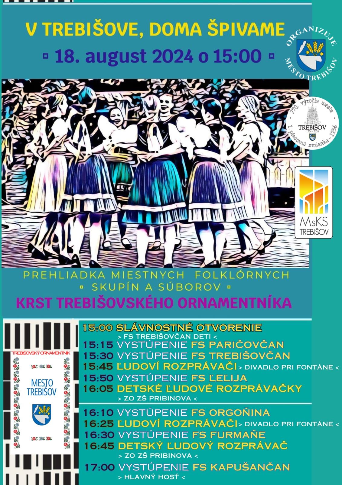 Slávnostné otvorenie folklórnej prehliadky deťmi z FS Trebišovčan, bude spojené s krstom TREBIŠOVSKÉHO ORNAMENTNÍKA, po ktorom sa na pódiu mestského amfiteátra predstavia títo účinkujúci: