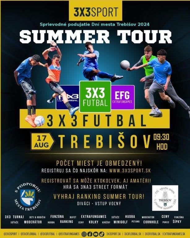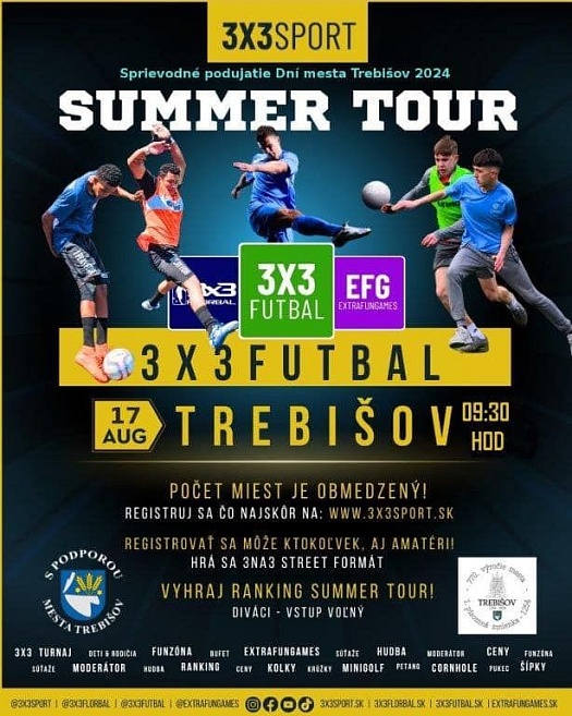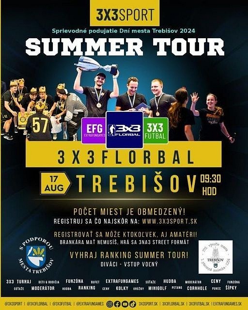 Ďalším sprievodným podujatím Dní mesta Trebišov 2024 v rámci športových akcií je aj 3x3 turnaj vo florbale a 3x3 turnaj vo futbale. Brankára mať netreba, hrá sa rovnako 3na3 v street formáte.