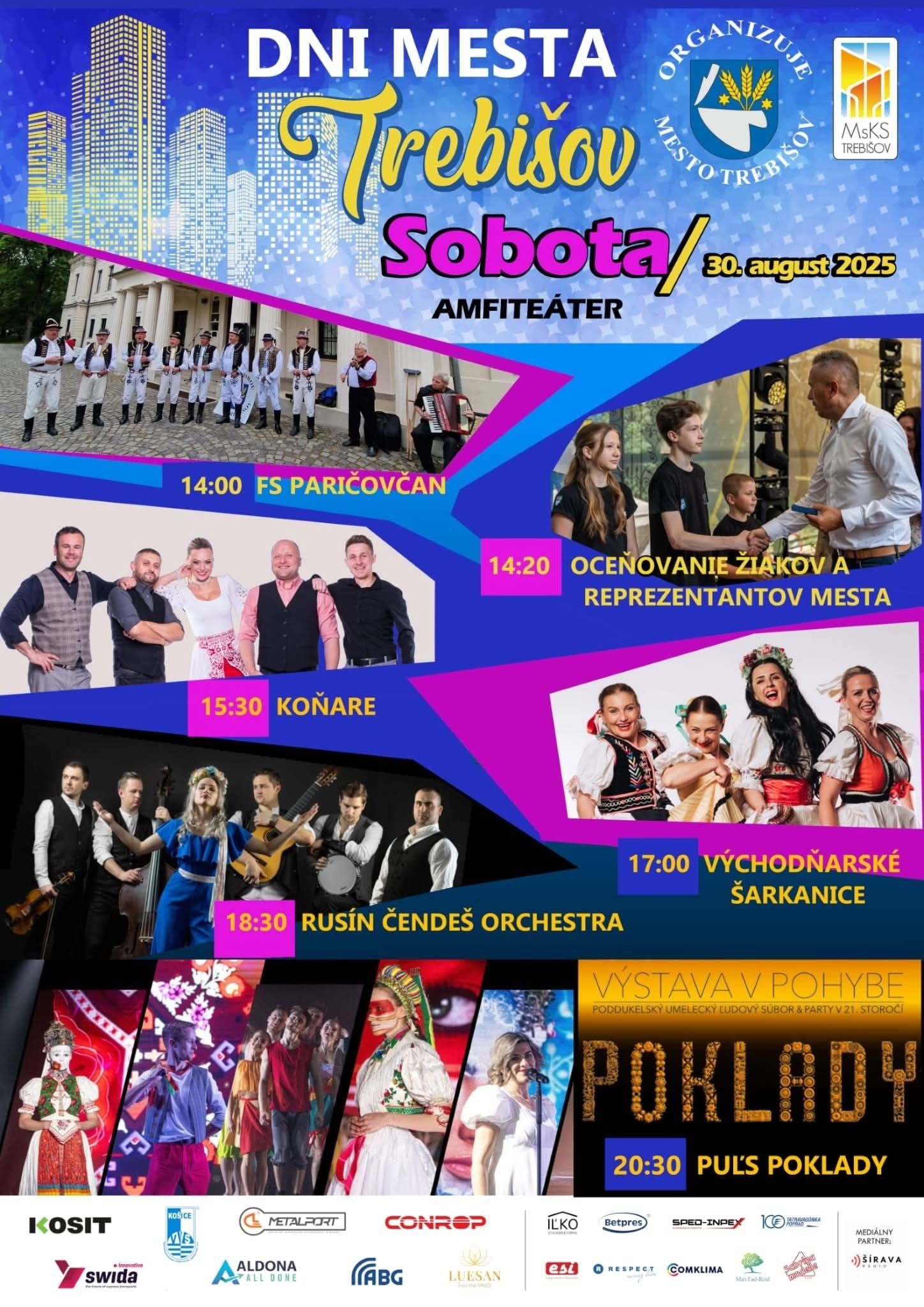 Aj tento rok vás pozývame na pestrý sobotný program 30.08. 2025 v rámci Dní mesta Trebišov! Čaká vás skvelá zábava, folklór, oceňovanie úspešných žiakov, výnimočné koncerty a vystúpenia.