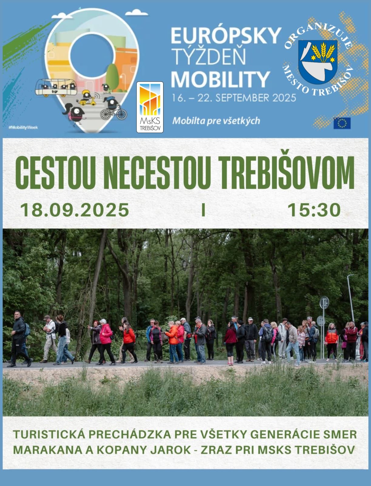 V rámci Európskeho týždňa mobility 2025 vás pozývame na spoločnú turistickú prechádzku, počas ktorej spoznáme krásy Trebišova trochu inak – cestou necestou.