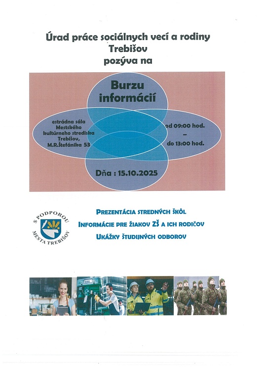 Aj tento rok vás Úrad práce sociálnych vecí a rodiny v Trebišove pozýva na Burzu informácií, ktorá sa uskutoční v stredu 15.10.2025 od 09:00 do 13:00 v estrádnej sále Mestského kultúrneho strediska v Trebišove.