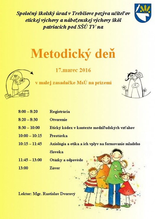 Spoločný školský úrad v Trebišove pozýva učiteľov etickej výchovy a náboženskej výchovy škôl patriacich pod SŠÚ TV na Metodický deň, ktorý sa uskutoční 17. marca 2016 v malej zasadačke MsÚ v Trebišove.