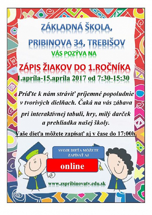 Zápis žiakov do 1. ročníka na Základnej škole, Pribinova 34, sa uskutoční od 1. do 15. apríla 2017.
