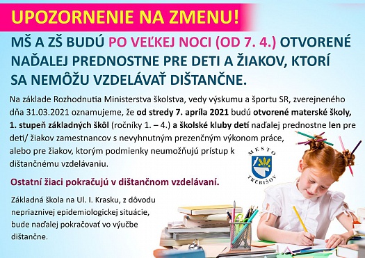 Na základe Rozhodnutia Ministerstva školstva, vedy výskumu a športu č. 2021/10079:4-A1810, zverejneného dňa 31.03.2021 oznamujeme, že od stredy 7. apríla 2021 budú otvorené materské školy, 1. stupeň základných škôl (ročníky 1. – 4.), a školské kluby detí naďalej prednostne len pre deti/ žiakov zamestnancov s nevyhnutným prezenčným výkonom práce, alebo pre žiakov, ktorým podmienky neumožňujú prístup k dištančnému vzdelávaniu.