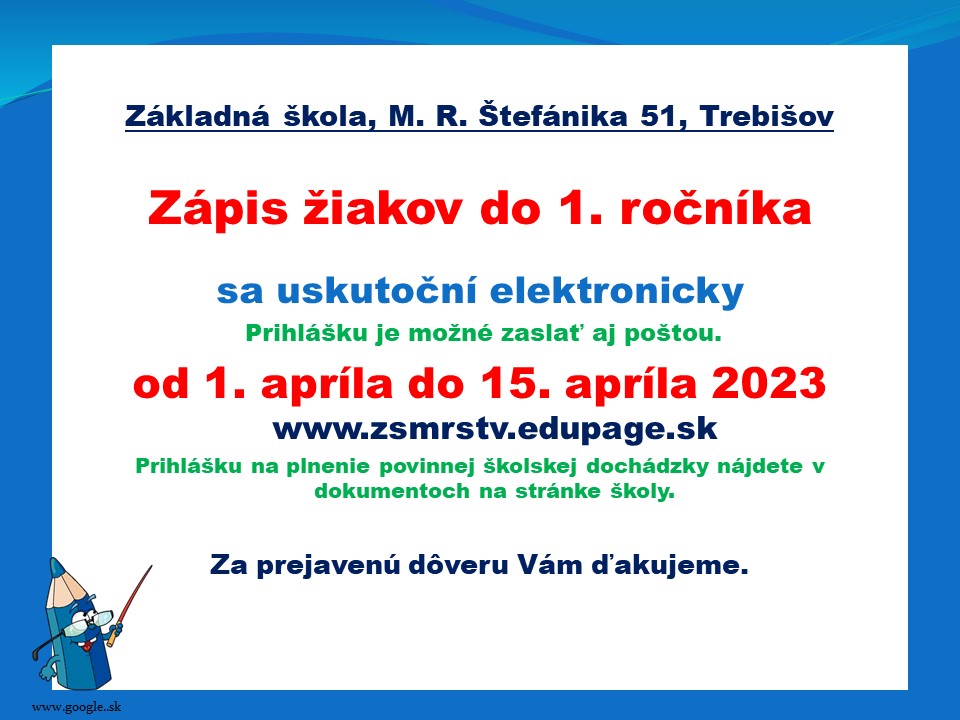 Zápis žiakov do 1. ročníka v ZŠ na Ul. M. R. Štefánika sa uskutoční elektronicky - elektronickou prihláškou v termíne od 1. apríla do 15. apríla 2023.